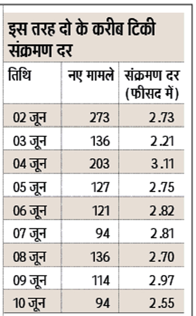 जागरण संवाददाता, देहरादून। मई शुरू होते ही दून में संक्रमण दर तेजी से ऊपर चढ़ी। करीब 13 दिन की तेजी के बाद उसी रफ्तार से कोरोना के मामले घटने भी लगे। हालांकि, संक्रमण दर के दो फीसद के करीब आने के बाद इसमें ठहराव आ गया है। पहली दफा दून में दो जून को संक्रमण दर तीन फीसद से नीचे आ गई थी। तब से अब तक नौ दिन हो चुके हैं और संक्रमण दर इसी आंकड़े के इर्द-गिर्द सिमटी है।