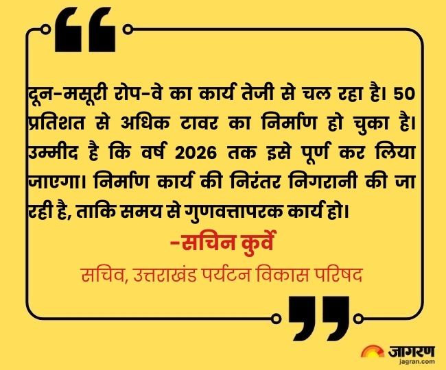 जागरण संवाददाता, देहरादून। Dehradun-Mussoorie Ropeway: तेज गति से हो रहे दून-मसूरी रोप-वे परियोजना के कार्य में 15 टावर का काम पूरा हो गया है। जबकि कुल 26 टावर बनाए जाने हैं। मसूरी के गांधी चौक में बनने वाले अपर टर्मिनल के लिए समतलीकरण कर दिया गया।