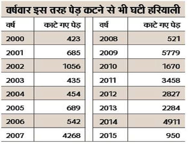 इन नदियों का पानी मानक से 76 गुना प्रदूषित हो गया है। हरियाली की बात करें तो वर्ष 2000 से 2015 के बीच सरकारी आंकड़ों में ही 30 हजार से अधिक पेड़ काटे डाले गए। हर साल पर्यावरण संरक्षण के नाम पर हजारों पौधे लगाए जाते हैं, मगर उनकी प्रकृति सजावटी प्रजाति के पादपों से आगे नहीं बढ़ पाती। लिहाजा, शहर के 15 किलोमीटर के दायरे में ही तापमान में पांच डिग्री का अंतर पाया गया है। साफ है कि जहां जितनी संख्या में पेड़ कम हैं, वहां का तापमान उतना ही अधिक रहता है।