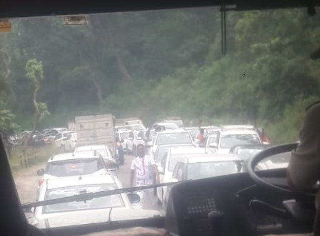 (वीकेंड पर पर्यटकों की आमद से दून-दिल्ली हाइवे पर भारी जाम। मोहंड में पिछले कई घंटे से फंसे हैं वाहन)