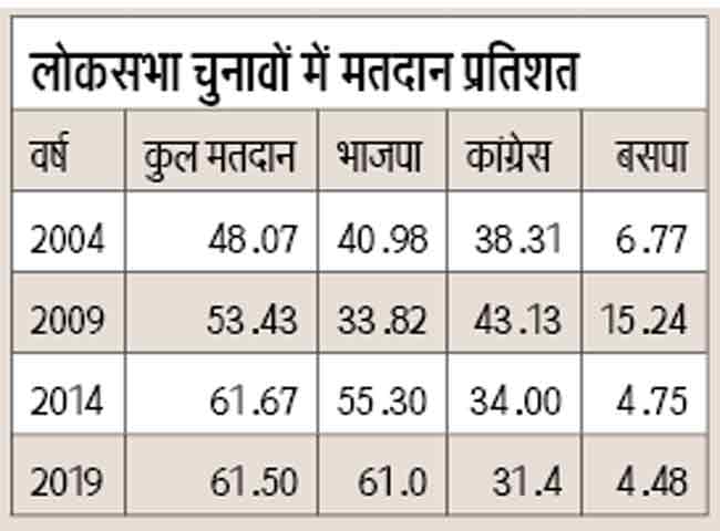सत्रहवीं लोकसभा के लिए उत्तराखंड की पांचों सीटों पर 61.50 फीसद मतदान हुआ। हालांकि यह वर्ष 2004 व 2009 के मतदान से ज्यादा रहा लेकिन 2014 के मुकाबले थोड़ा सा कम। तब 61.67 प्रतिशत मतदान हुआ था। पिछली बार के लगभग बराबर ही रहे वोटर टर्नआउट ने सियासी पार्टियों के साथ ही राजनैतिक विश्लेषकों को भी उलझन में डाल दिया था लेकिन अब नतीजे आने के बाद साफ हो गया कि मतदान प्रतिशत में बगैर बढ़ोतरी भी इस बार कितनी शिद्दत से मोदी के नाम का अंडर करंट चला। भाजपा ने सत्रहवीं लोकसभा के लिए हुए चुनाव में कुल 61.0 फीसद मत पाकर दूसरे स्थान पर 31.4 फीसद मत हासिल करने वाली कांग्रेस को 29.60 फीसद मतों के अंतर से पीछे छोड़ दिया। बसपा को राज्य की चार सीटों पर 4.48 फीसद मत प्राप्त हुए। पांचों सीटों पर 'नोटा' को कुल 1.05 फीसद मत पड़े।