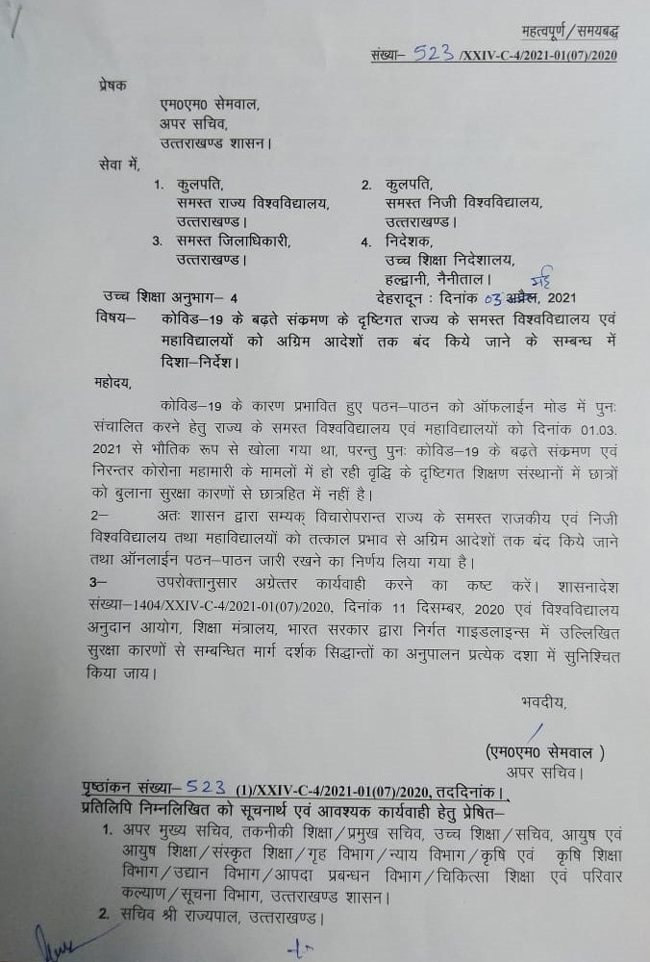कोरोना संक्रमण के लगातार बढ़ते मामलों को देखते हुए उत्तराखंड में सरकारी व निजी विश्वविद्यालय व डिग्री कॉलेज अग्रिम आदेश तक बंद रहेंगे। शासन ने कोविड महामारी को देखते हुए जारी किया आदेश। ऑनलाइन पढ़ाई जारी रखने के निर्देश दिए।