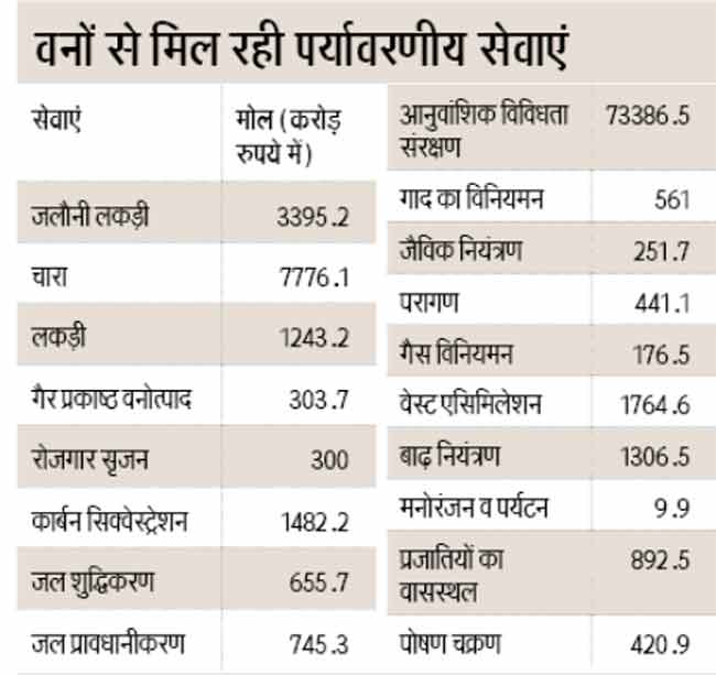 नियोजन विभाग की ओर से हाल में राज्य के वनों से मिलने वाली पर्यावरणीय सेवाओं का आकलन कराया गया। इसमें जलौनी लकड़ी, चारा, गैर प्रकाष्ठ वनोत्पाद, रोजगार सृजन, आनुवांशिक विविधता संरक्षण समेत 18 बिंदुओं को शामिल किया गया।
