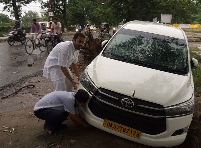 वहीं अचानक आई आंधी के चलते केंद्रीय कपड़ा राज्यमंत्री अजय टम्टा की गाड़ी के आगे पेड़ गिर गया। दरअसल, टम्टा कलक्ट्रेट सभागार में नीति आयोग की बैठक से जौलीग्रांट एयरपोर्ट लौटने के लिए भेल सेक्टर चार पीठ बाजार तक पहुंचे ही थे कि अचानक एक पेड़ गिर पड़ा। हालांकि चालक ने तत्परता दिखाते हुए गाड़ी मोड़ ली। इससे गाड़ी सड़क किनारे गड्ढे में जा पहुंची। हालांकि इस दौरान कोर्इ हताहत नहीं हुआ।