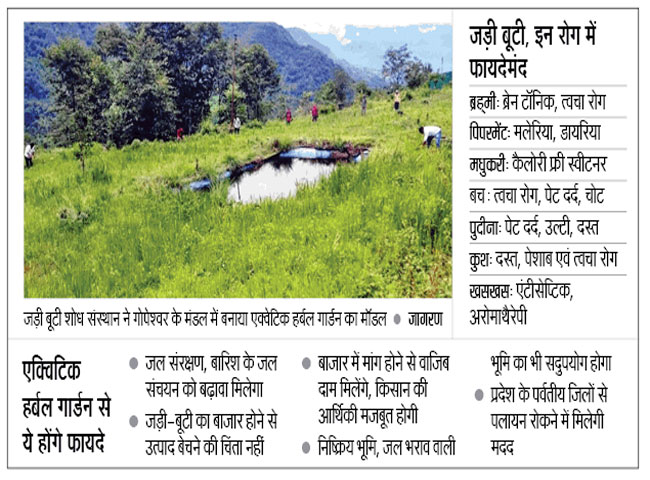 देहरादून, अंकुर शर्मा। जैसे भी संभव हो जल, जंगल, जमीन को बचाना जरूरी है। जड़ी-बूटी शोध एवं विकास संस्थान ने ऐसी ही अनूठी पहल की है। संस्थान ने गोपेश्वर में एक गड्ढे में पानी भरकर एक्विटिक हर्बल गार्डन (जलीय औषधीय उद्यान) बनाया है। इस गार्डन में विलुप्ति की कगार पर पहुंच चुकी जलीय जड़ी बूटी, औषधीय वनस्पतियों को रोपा गया है। ये वनस्पतियां कई गंभीर बीमारियों में रामबाण औषधि भी हैं। इससे जड़ी-बूटी की खेती को और जलीय स्रोत, जल संरक्षण दोनों को बढ़ावा मिलेगा। इस मॉडल के जरिये संस्थान किसानों को जड़ी बूटी के खेती को प्रेरित करना चाहता है।