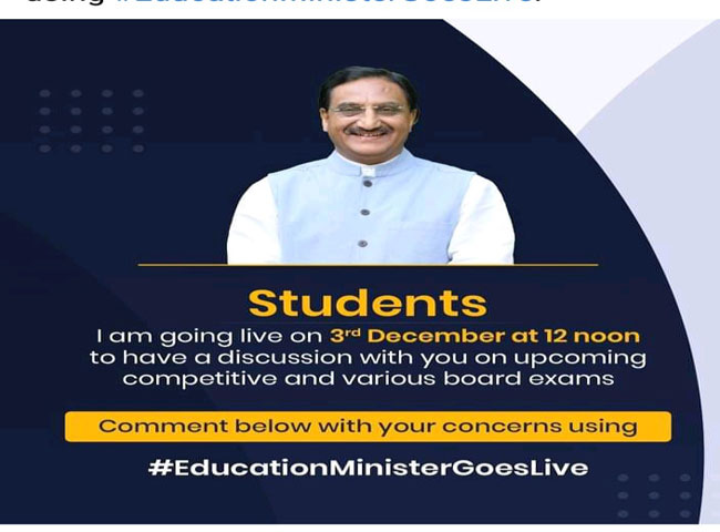 केंद्रीय शिक्षा मंत्री डॉ. रमेश पोखरिया निशंक ने छात्रों की मनःस्थिति को भांप उनसे संवाद करने का निर्णय लिया है। निशंक ने बताया कि कंपटीशन और बोर्ड परीक्षाएं देने वाले छात्रों की चिंता वाजिब है, लेकिन उन्हें अधिक चिंता करने की आवश्यकता नहीं है। हम उनकी मनोदशा को अच्छी तरह समझ सकते हैं। छात्रों का मनोबल बढ़ाने, उनकी समस्याओं से संबंधित सवालों का जवाब देने और उनकी जिज्ञासाओं को शांत करने के लिए मैं 3 दिसंबर को बच्चों के लिए उपलब्ध रहूंगा।