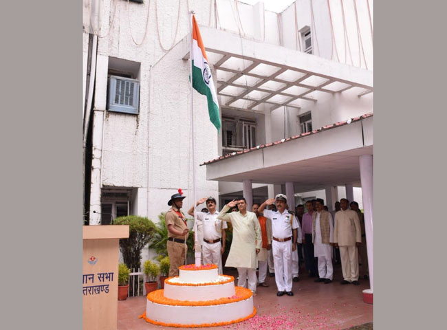विधानसभा परिसर देहरादून में आज उत्तराखंड विधानसभा अध्यक्ष प्रेमचंद अग्रवाल ने 73वें स्वतंत्रता दिवस के अवसर पर ध्वज फहराया। ध्वजारोहण के बाद विधानसभा अध्यक्ष ने स्वतंत्रता दिवस पर सभी को हार्दिक शुभकामनायें देते हुए कहा कि 15 अगस्त हमेशा हमारे लिए इतना खास रहा है कि एक दिन जब हम अपने देश की सारी महिमा याद करते हैं क्योंकि हम संघर्ष, विद्रोह और भारतीय स्वतंत्रता से लड़ने वाले भारतीय स्वतंत्रता सेनानियों के प्रयासों को याद करते हैं। इस दौरान उन्होंने उत्तराखंड के लिए हुए राज्य आंदोलन के सभी शहीदों तथा आंदोलनकारियों को भी शत-शत नमन करते हुए श्रद्धांजलि अर्पित की एवं उन शहीदों को भी श्रद्धांजलि अर्पित की जिन्होंने सीमा पर अपनी जान की बाजी लगाकर भारत माता की सेवा में अपना सब कुछ न्यौछावर कर दिया। उन्होंने कहा कि लोकतंत्र के रास्ते पर चलकर हमनें तीव्र गति से विकास किया है। देश आज हम सब के लोकप्रिय प्रधानमंत्री नरेंद्र मोदी के नेतृत्व में नए भारत की ओर तेजी से बढ़ रहा है। उन्हीं के रास्ते पर चलते हुए प्रदेश सरकार भी उत्तराखंड को विकास के रास्ते पर ले जा रही है।