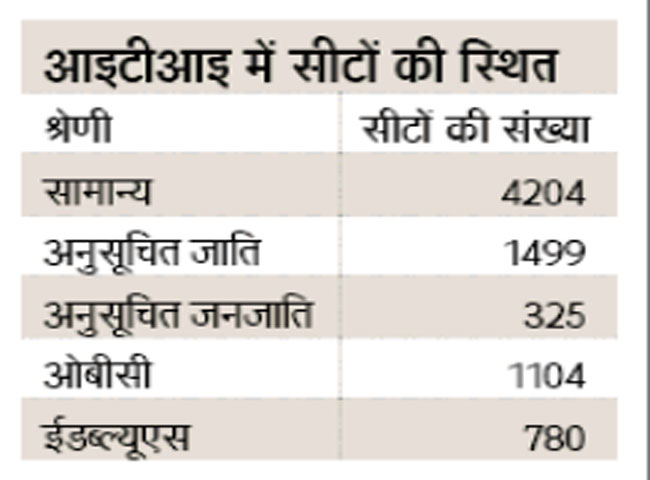 विदित रहे कि पहली बार आर्थिक रूप से कमजोर सवर्ण छात्र-छात्रओं को ईडब्ल्यूएस का लाभ देते हुए प्रदेश की 88 आइटीआइ में 780 सीटें आर्थिक रूप से कमजोर सवर्ण छात्र-छात्रओं के लिए आरक्षित हैं। इनमें से करीब डेढ़ सौ सीटें ही भरी हैं। प्रदेश भर की आइटीआइ की 7912 सीटों के लिए 11501 छात्र-छात्रओं को मेरिट में स्थान दिया गया था। नेशनल काउंसिल फॉर वोकेशनल ट्रेनिंग (एनसीवीटी) के तहत संचालित प्रदेशभर के 88 राजकीय औद्योगिक प्रशिक्षण संस्थानों (आइटीआइ) की काउंसिलिंग के लिए 15293 छात्र-छात्रओं ने आवेदन किया था, विभाग के प्रशिक्षण एवं सेवायोजन निदेशालय ने मेरिट लिस्ट छात्र-छात्रओं की च्वाइस फिलिंग के आधार पर तैयार की। प्रदेश में एनसीवीटी आइटीआइ के 32 ट्रेडों में दाखिला हुए। राजकीय औद्योगिक प्रशिक्षण संस्थान (आइटीआइ) में नेशनल काउंसिल फॉर वोकेशनल ट्रेनिंग (एनसीवीटी) के तहत संचालित ट्रेडों में इस बार छात्रों को प्रवेश परीक्षा से नहीं गुजरना पड़ा। आठ से 11 अगस्त तक छात्रों ने ऑनलाइन काउंसिलिंग में पंजीकरण, च्वाइस फिलिंग व च्वाइस लॉक की। इसकी पुष्टि प्रशिक्षण एवं सेवायोजन निदेशालय के उपनिदेशक जेएस नेगी ने की।
