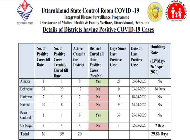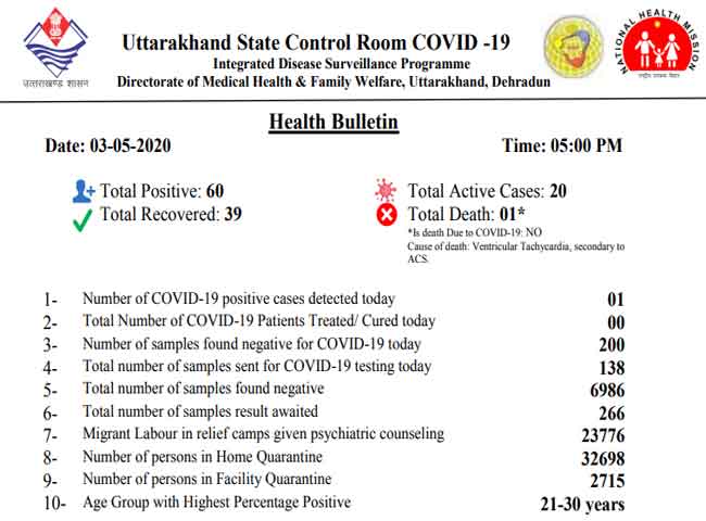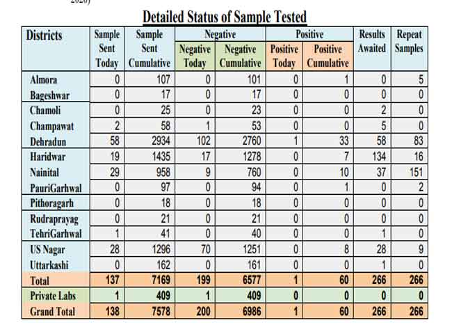 प्रदेश में अब तक 7046 सैंपल की जांच की गई है। जिनमें 6986 की रिपोर्ट निगेटिव व 60 केस पॉजिटिव आए हैं। इसके अलावा दिल्ली में कोरोना संक्रमित पाए गए एक बुजुर्ग का भी एम्स ऋषिकेश में उपचार चल रहा है। जनपद देहरादून में सर्वाधिक 33 मरीज सामने आए हैं। जबकि नैनीताल में दस, ऊधमसिंह नगर में आठ, हरिद्वार में सात और अल्मोड़ा व पौड़ी में एक-एक मामला आया है।