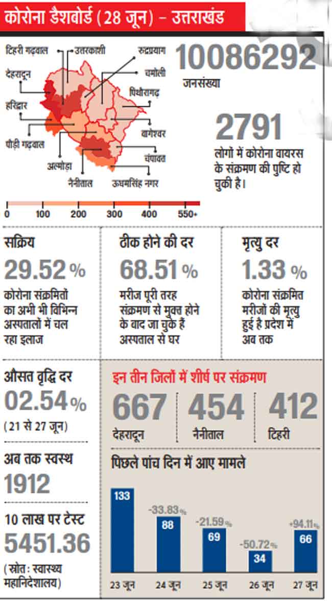 स्वास्थ्य महानिदेशालय के आंकड़ों के मुताबिक राज्य में अब तक कोरोना के 2791 मामले सामने आ चुके हैं, इनमें से 1912 लोग स्वस्थ हो चुके हैं। वर्तमान में 824 एक्टिव केस हैं। कोरोना संक्रमित 37 लोगों की मौत भी हो चुकी है। जबकि 18 मरीज राज्य से बाहर जा चुके हैं। अच्छी बात यह कि पिछले कई दिनों से राज्य का रिकवरी रेट सुधर रहा है। पखवाड़ेभर में ही इसमें करीब 16 फीसद का उछाल आया है। सुखद पहलू यह कि एक्टिव केसों की तुलना में दोगुना से अधिक मरीज अब तक ठीक हो चुके हैं।