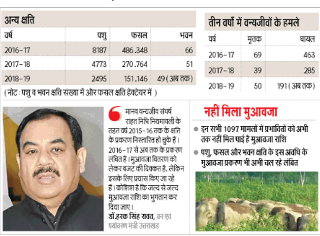 वर्ष 2016-17 से अब तक के परिदृश्य को देखें तो वन्यजीवों के हमलों में 158 लोगों की जान गई। इनमें सबसे अधिक हमले बाघ व गुलदार के थे। घायलों की बात करें तो इसी अवधि में 939 लोग घायल हुए। इन सभी मामलों में अभी तक सरकार से मिलने वाली मुआवजा राशि प्रभावित परिवारों को नहीं मिल पाई है। ऐसा ही सूरतेहाल पशु, फसल व भवन क्षति के मामलों में भी हैं। विभाग बजट की कमी का रोना रोकर फिलहाल मुआवजा राशि वितरित करने में हाथ खड़े कर रहा है।