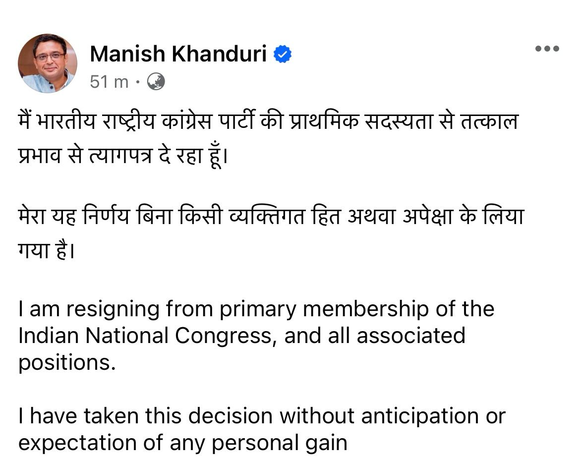 इंटरनेट मीडिया पर पोस्ट में मनीष खंडूड़ी ने कहा कि वह स्वेच्छा से त्यागपत्र दे रहे हैं। उन्होंने लिखा कि मैं भारतीय राष्ट्रीय कांग्रेस पार्टी की प्राथमिक सदस्यता से तत्काल प्रभाव से त्यागपत्र दे रहा हूं।