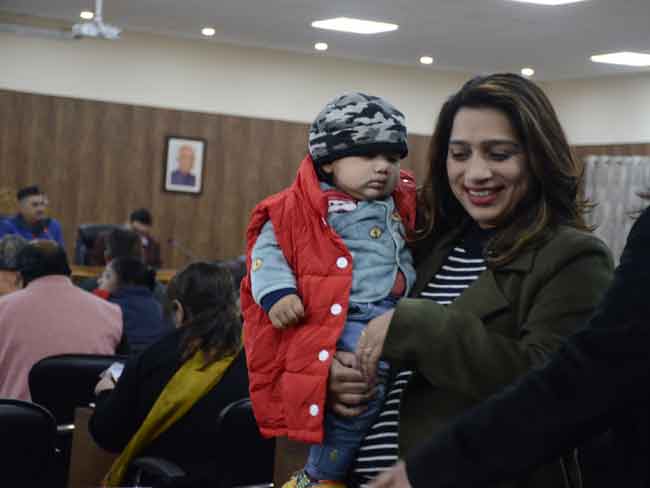 (फोटोः नगर निगम सभागार में आयोजित बोर्ड बैठक में अपनी बच्चे को लेकर बैठक में पहुंची वार्ड 76 की पार्षद श्रद्धा सेठी।)
