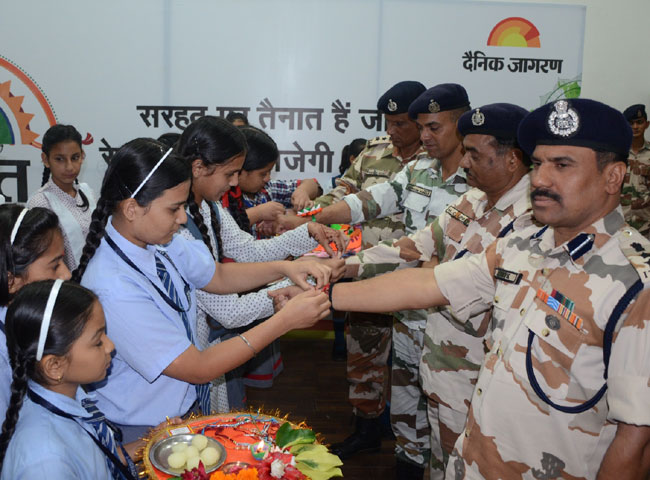 देश की आन, बान और शान के लिए परिवार से दूर रहने वाले हिमवीरों की कलाई पर विभिन्न स्कूलों की छात्राओं ने राखी सजाई तो वह भावुक हो गए। उन्होंने बहनों को उपहार तो दिए ही, साथ ही रक्षा का वचन भी दिया। मौका था दैनिक जागरण की ओर से भारत तिब्बत सीमा पुलिस बल (आइटीबीपी) उत्तरी फ्रंटियर के सीमाद्वार स्थित मुख्यालय में 'भारत रक्षा पर्व' का। इस दौरान सांस्कृतिक प्रस्तुतियों ने भी खूब समां बांधा और पूरा माहौल देशभक्ति से सराबोर हो गया। 'भारत रक्षा पर्व' के तहत विभिन्न स्कूलों की छात्राओं व महिला संगठनों ने सीमा पर तैनात सैनिकों के लिए राखियां और ग्रीटिंग कार्ड्स बनाए थे। पिछले दिनों दून पहुंचा रक्षा रथ राखियों को लेकर बार्डर के लिए रवाना हुआ था। लेकिन छात्राओं ने कुछ राखियां संभाल कर रख ली थी। जिन्हें शुक्रवार को उन्होंने हिमवीरों की कलाई पर बांधा। कार्यक्रम की शुरुआत हिल फाउंडेशन ऐकेडमी की छात्राओं ने गणेश वंदना के साथ की। इसके बाद नृत्य नाटिका ऐसा देश है मेरा की प्रस्तुति दी। नृत्यों की मनमोहक छटा बिखेरने का सिलसिला एक के बाद एक चलता रहा। इस बीच स्कूली छात्राओं ने हिमवीरों की कलाई पर राखियां बांधी और उन्हें ग्रीटिंग कार्ड्स भी दिए।