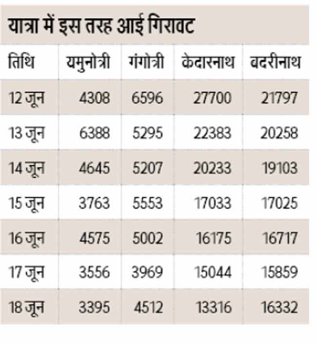देहरादून, जेएनएन। मानसून से पूर्व मौसम के उखड़े मिजाज का असर चारधाम यात्रा भी साफ नजर आने लगा है। एक सप्ताह पूर्व जहां 60 से 70 हजार यात्री रोजाना चारों धाम पहुंच रहे थे, वहीं अब यह संख्या 37 हजार के आसपास रह गई है। बीते सप्ताह में तो हर दिन यात्रियों की संख्या में कमी आई है। सबसे ज्यादा गिरावट केदारनाथ आने वाले यात्रियों की संख्या में आई है।