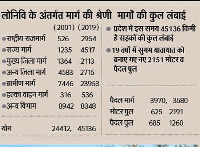 देहरादून, विकास गुसाईं। अलग राज्य बनने के बाद उत्तराखंड ने अवस्थापना सुविधाओं के लिहाज से तेजी से कदम बढ़ाए हैं। विशेषकर पर्वतीय क्षेत्रों की लाइफ लाइन कही जाने वाली सड़कों की बात करें तो बीते 19 वर्षों में प्रदेश में सड़कों की लंबाई 24412 किमी से बढ़कर 45136 किमी हो गई है। पुलों की संख्या 1300 से बढ़कर 3451 हो गई है। इस ढांचागत विकास ने पहाड़ों के दुर्गम सफर की राह आसान की है। हालांकि, प्रदेश में अभी भी कई स्थानों पर कुल 14218 किमी कच्चे मोटर मार्ग हैं, जिन्हें पक्का किया जाना है। इसके अलावा 3580 किमी लंबाई के पैदल मार्ग हैं, जिन्हें पक्का करने के साथ ही मोटर वाहन मार्ग से जोड़ा जाना शेष है।