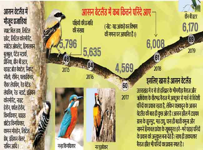 चकराता वन प्रभाग की आसन रेंज के रेंजर जवाहर सिंह तोमर व वन बीट अधिकारी प्रदीप सक्सेना बताते हैं कि वर्तमान में 28 प्रजातियों के करीब एक हजार पङ्क्षरदे आसन नमभूमि में मौजूद हैं। टाइफा ग्रास व घोसलों से चूजों की चहचहाहट अद्भुत नजारा पेश कर रही है। यहां सबसे मनमोहक नजारा स्पाट बिल्ड डक पेश करती है। मादा स्पाट बिल्ड डक के पीछे चलते नन्हें परिंदों की लाइन देखना ज्यादा आकर्षक है। स्पाट बिल्ड डक एक बार में आठ से दस अंडे देती है और चूजे एक साथ ही अंडे से बाहर आते हैं।