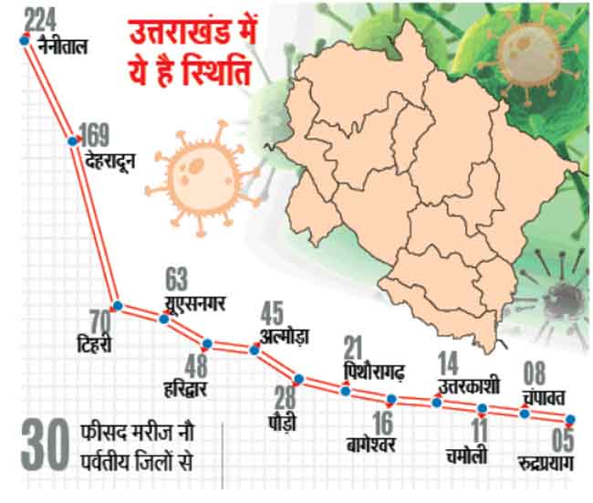 पौड़ी व अल्मोड़ा में बस एक-एक मामला ही आया था। जबकि सात अन्य जनपदों में एक भी मामला नहीं था। पर अभी की स्थिति में टिहरी यूएसनगर व हरिद्वार को पीछे छोड़ मरीजों की संख्या के लिहाज से तीसरे नंबर पर आ गया है। यहां कोरोना के 70 मामले हैं। यह कुल मामलों का दस फीसद है।