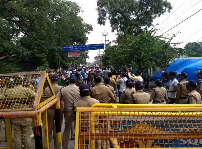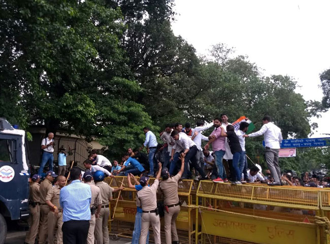 बढ़ती बेरोजगारी की समस्या को लेकर एनएसयूआइ कार्यकर्ताओं ने मंगलवार दोपहर करीब डेढ़ बजे सीएम आवास कूच किया। हाथीबड़कला में पहले से ही भारी पुलिस बल तैनात कर बैरिकेडिंग लगाई गई थी। जुलूस के पहुंचते ही पुलिस ने बल पूर्वक छात्रों को रोकने का प्रयास किया। इससे नाराज एनएसयूआइ और कांग्रेसी नेताओं ने जबरन बेरिकेडिंग फांदनी शुरू कर दी। भीड़ को नियंत्रित करने के लिए पुलिस ने वाटर कैनन का प्रयोग किया।