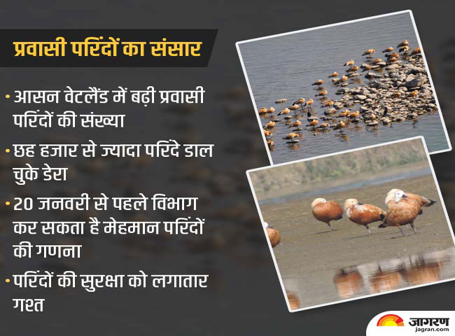 आसन वेटलैंड में इस बार अब तक छह हजार से अधिक प्रवासी परिंदे डेरा डाल चुके हैं। ठंड बढ़ने के साथ ही इनकी संख्या में लगातार इजाफा हो रहा है। इनकी सुरक्षा को चकराता वन प्रभाग की सशस्त्र टीम रात-दिन गश्त कर रही है।