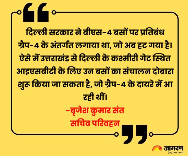 उत्तराखंड परिवहन निगम की पुरानी डीजल बसों को दिल्ली में प्रवेश की अनुमति मिल सकती है। दिल्ली सरकार ने ग्रैप-4 के अंतर्गत बीएस-4 श्रेणी की बसों पर प्र ...और पढ़ें