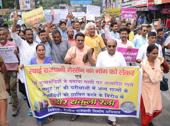 परेडग्राउंड के पास गैरसैंण स्थायी राजधानी की मांग को लेकर आंदोलन कर रहे संगठनों ने शनिवार को सरकार के खिलाफ डौंर-थकुली रैली निकाल कर रोष जताया। रैली परेडग्राउंड स्थित धरना स्थल से होते हुए घटाघर स्थित स्व. इंद्रमणि बडोनी की प्रतिमा तक निकाली गई।