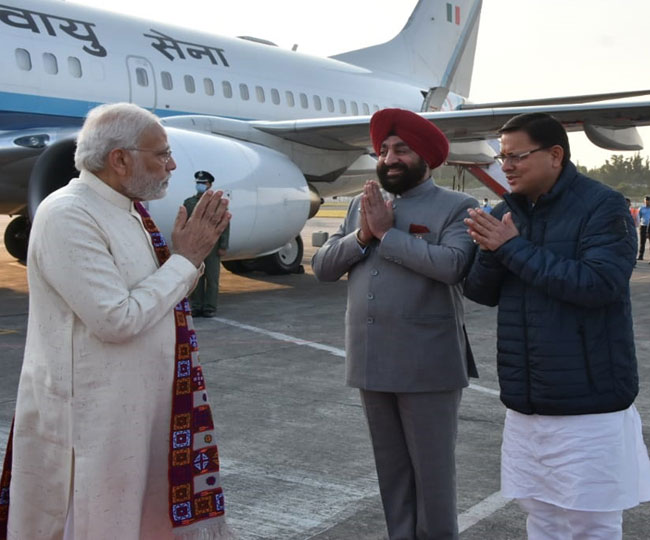 शुक्रवार को प्रधानमंत्री नरेन्द्र मोदी सुबह करीब सात बजे वायुसेना के विशेष विमान से देहरादून के जौलीग्रांट एयरपोर्ट पहुंचे। इस दौरान एयरपोर्ट पर राज्यपाल ले सेनि गुरमीत सिंह, मुख्यमंत्री पुष्कर सिंह धामी, विधानसभा अध्यक्ष ऋतु भूषण खंडूड़ी, केंद्रीय राज्य मंत्री अजय भट्ट भी मौजूद रहे। जब प्रधानमंत्री देहरादून पहुंचे तो वह कुर्ता पायजामा के नजर आए।