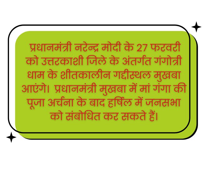 PM Modi Uttarkashi Visit प्रधानमंत्री नरेंद्र मोदी 27 फरवरी को उत्तराखंड के उत्तरकाशी जिले का दौरा करेंगे। इस दौरान वह गंगोत्री धाम के शीतकालीन गद्दीस्थल मुखबा में मां गंगा की पूजा-अर्चना करेंगे और हर्षिल में जनसभा को संबोधित करेंगे। पीएम मोदी के इस दौरे को लेकर राज्य सरकार तैयारियों में जुट गई है। मुख्य सचिव राधा रतूड़ी ने प्रधानमंत्री के प्रस्तावित कार्यक्रम और तैयारियों की समीक्षा की।