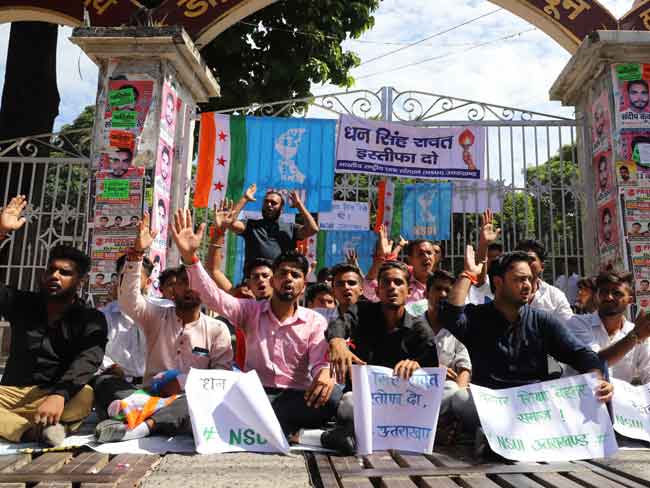 एनएसयूआइ के प्रदेश अध्यक्ष मोहन भंडारी ने डीएवी कॉलेज में तालाबंदी कर प्रदेश सरकार के खिलाफ नारेबाजी की। उन्होंने कहा कि प्रदेशभर के कॉलेजों में शिक्षकों के पद रिक्त होने के कारण छात्रों की पढ़ाई प्रभावित हो रही है। इसी मांग को लेकर करीब दो माह पूर्व एनएसयूआइ के कार्यकर्ता उच्च शिक्षा राज्य मंत्री स्वतंत्र प्रभार डॉ. धन सिंह रावत से मिले।