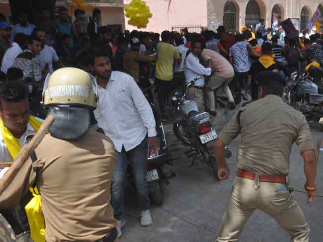 मौके पर मौजूद पुलिस इंस्पेक्टर डालनवाला राजीव रौथाण ने कपिल को समझाने की कोशिश की, लेकिन वह नहीं माने और बदतमीजी पर उतर आए। संगठन के अन्य छात्र भी वहां पर हंगामा करने लगे। इसके बाद पुलिस ने लाठियां भांजनी शुरू कर दी। पुलिस की लाठीचार्ज से छात्र-छात्राओं की भगदड़ मच गई। पुलिस ने मुख्य नियंता कार्यालय से कॉलेज के मुख्य गेट तक जो भी छात्र देखा उस पर लाठी बरसाई।