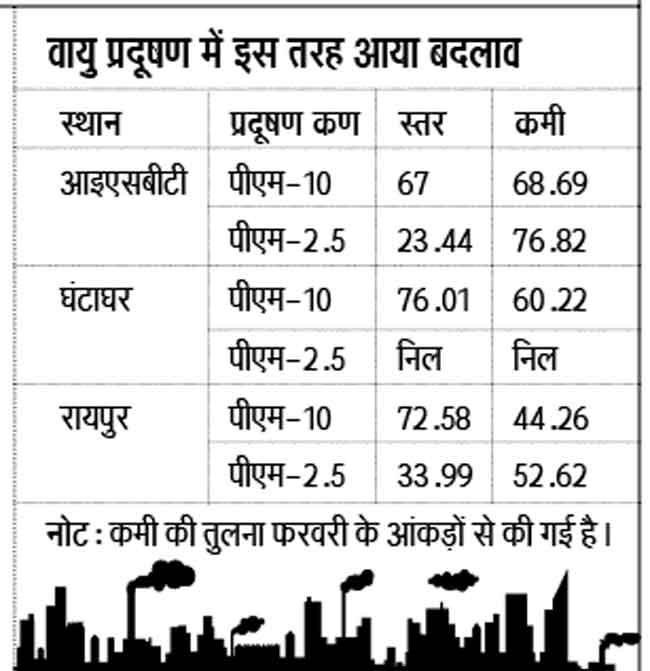 आमतौर पर दून में वायु प्रदूषण का ग्राफ मानक से दो गुना से भी अधिक रहता है, मगर जनता कर्फ्यू के दिन 22 मार्च को यह आंकड़ा पीएम-2.5 में 81 फीसद से भी नीचे पहुंच गया था। अंतरराष्ट्रीय स्तर की वेबसाइट विंडी के अनुसार पीएम-2.5 का स्तर 20 माइक्रोग्राम प्रति क्यूबिक मीटर पर आ गया था। उत्तराखंड पर्यावरण संरक्षण एवं प्रदूषण नियंत्रण बोर्ड के 14 मार्च तक के आंकड़े बताते हैं कि दून में पीएम-10 का अधिकतम स्तर 193.82 माइक्रोग्राम प्रति क्यूबिक मीटर (मानक 100) आइएसबीटी पर था। वहीं, पीएम-2.5 का अधिकतम स्तर इसी साइट पर 97.69 माइक्रोग्राम प्रति क्यूबिक मीटर (मानक 60) था। यह स्थिति भी तब थी कि कोरोना के चलते 14 मार्च तक सड़कों पर आवाजाही काफी कम हो गई थी।