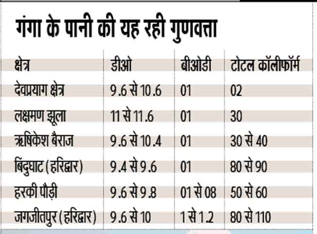 प्रदूषण नियंत्रण बोर्ड के सदस्य सचिव एसपी सुबुद्धि बताते हैं कि लॉकडाउन के दौरान ऋषिकेश के पास लक्षमणझूला साइट पर फीकल कॉलीफॉर्म (सीवर जनित तत्व) की मात्रा में 47 फीसद की कमी पाई गई। इसी तरह ऋषिकेश बैराज में फीकल कॉलीफार्म में 46 फीसद, जबकि टोटल कॉलीफार्म में 26 फीसद की कमी दर्ज की गई। हरिद्वार क्षेत्र तक, जहां प्रदूषण सर्वाधिक रहता है, वहां भी 17 से 34 फीसद तक विभिन्न प्रदूषणकारी तत्व पानी में कम पाए गए। कुल मिलाकर चार स्थानों पर (देवप्रयाग, लक्ष्मणझूला, ऋषिकेश बैराज व हरकी पैड़ी) पानी एक ग्रेड पाया है। इसका मतलब यह है कि सिर्फ क्लोरीन मिलाकर इसे पी सकते हैं। वहीं बी ग्रेड पानी में स्नान संभव है।
