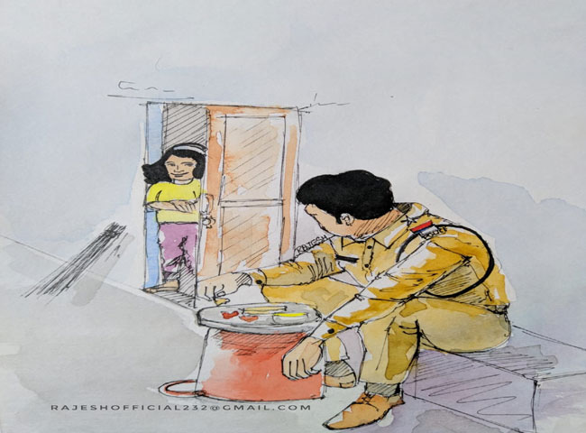 इस चित्र में राजेश ने एक पुलिसकर्मी को घर के बाहर बैठक भोजन करते दिखाया गया है, वहीं कुछ दूरी पर पुलिसकर्मी की नन्हीं बेटी दरवाजे की ओट से अपने पिता को देख रही है। हाल में ही उत्तराखंड पुलिस ने भी अपने ट्विटर हैंगर पर यह दोनों चित्र शेयर किए हैं। राजेश का कहना है कि कोरोना जैसी महामारी को हम तभी हरा सकते हैं, जब हम सभी एकजुट होकर अपना-अपना दायित्व निभाएंगे।