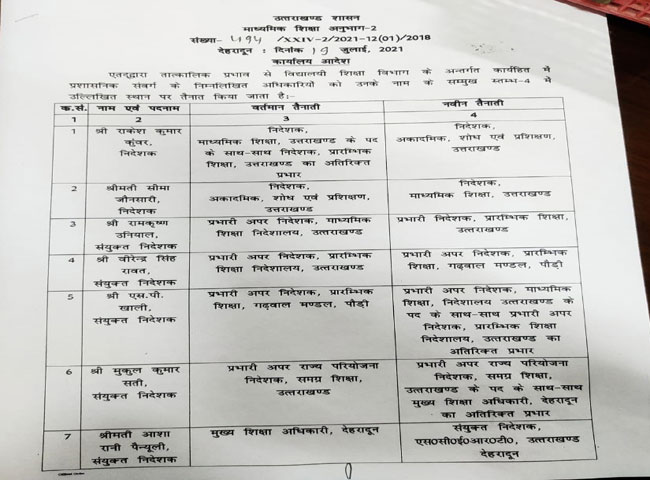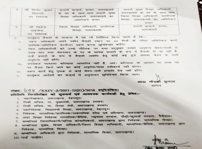 डा मुकुल कुमार सती को मौजूदा पदभार के साथ ही मुख्य शिक्षा अधिकारी देहरादून का अतिरिक्त प्रभार दिया गया है। आशारानी पैन्यूली को संयुक्त निदेशक एससीइआरटी की जिम्मेदारी दी गई है। विनोद कुमार सेमल्टी को प्रभारी मुख्य शिक्षा अधिकारी उत्तरकाशी के पद के साथ-साथ जिला शिक्षा अधिकारी प्रारंभिक शिक्षा उत्तरकाशी का अतिरिक्त प्रभार सौंपा गया है। वहीं, जितेंद्र सक्सेना को प्रभारी प्राचार्य डाइट उत्तरकाशी की जिम्मेदारी दी गई है।