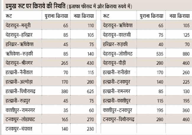 पहले दिन बसों में सवारिया पूरी नहीं हो पाई, मगर डिपो से रूट पर चलने वाली सेवाओं को जारी रखा गया है। देहरादून हरिद्वार के लिए भी नियमित सेवा शुरू की गई है। परिवहन निगम के उप महाप्रबंधक पीके भारती ने बताया कि बस किराए में प्रति किलोमीटर को दोगुना किया गया है। शेष यात्री कर, बीमा, यात्री सुविधा कर में कोई वृद्धि नहीं की गई है। उन्होंने बताया कि ऋषिकेश देहरादून रूट पर पांच, ऋषिकेश हरिद्वार रुट पर पांच, गोपेश्वर उत्तरकाशी पौड़ी के लिए एक एक बस सेवा उपलब्ध कराई गई है। दो बस सेवाएं अतिरिक्त रखी गई है।