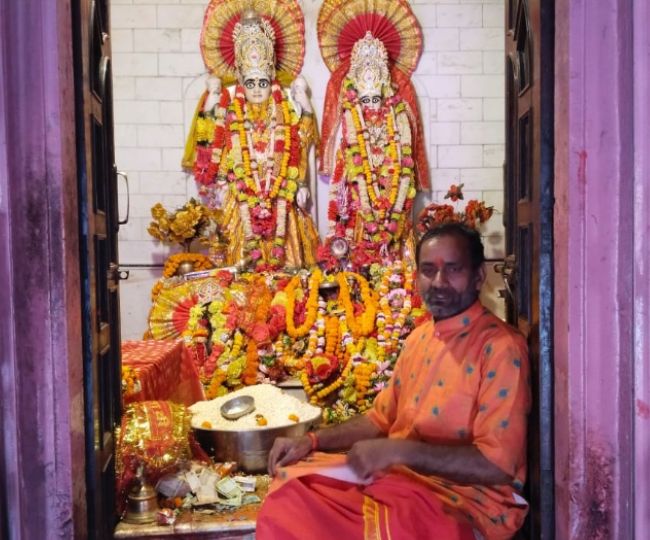 सत्यनारायण मंदिर स्थित लक्ष्मी नारायण जी का विग्रह व पुजारी।