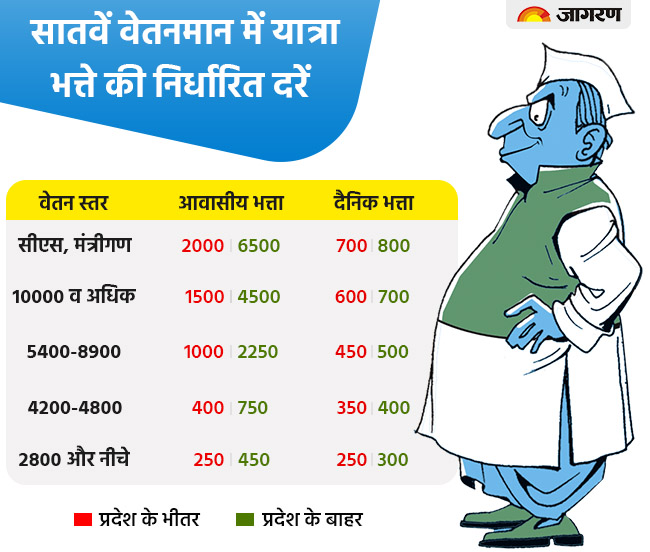 -यात्रा भत्ते में मंत्रीगण व मुख्य सचिव व समान रैंक के अधिकारियों के लिए हवाई सेवा बिजनेस क्लास और 10 हजार व उच्च ग्रेड वेतन के लिए इकोनोमी क्लास अनुमन्य, उक्त दोनों की श्रेणियों के लिए रेल सेवा एसी-प्रथम व एक्जीक्यूटिव क्लास व सड़क से एसी बेस सेवा स्वीकृत। -इससे नीचे 4200 ग्रेड वेतन तक रेल सेवा व एसी बस की अनुमति। इससे नीचे वेतन स्तर के लिए रेल सेवा स्लीपर क्लास व द्वितीय श्रेणी, साधारण बस सेवा।