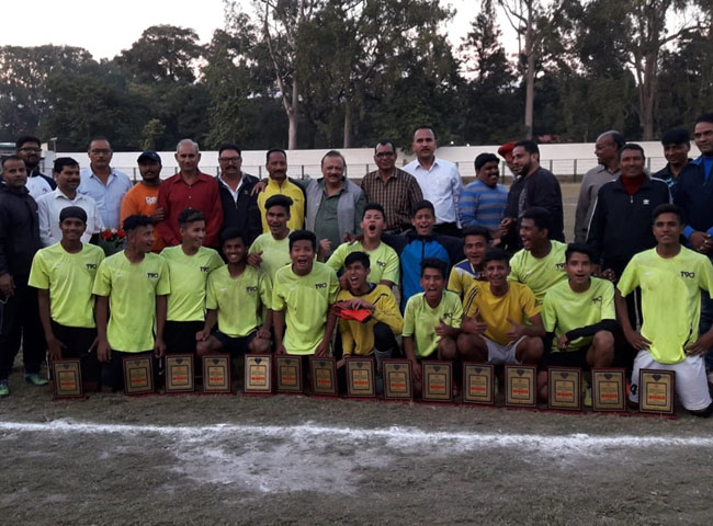 जिला स्तरीय अंडर-17 फुटबॉल प्रतियोगिता में एसजीआरआर रेसकोर्स ने टाईब्रेकर में स्टेडियम ट्रेनीज पवेलियन ग्राउंड को 4-3 से हराकर खिताब अपने नाम किया।