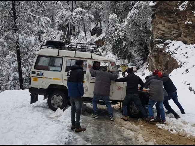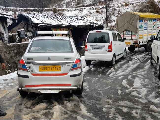 सोमवार रात हुई झमाझम बारिश के बाद मसूरी से ऊपर मंगलवार भोर से ही पहाड़ों पर बर्फबारी शुरू हो गई। बर्फबारी का आनंद उठाने के मसूरी में ठहरे तमाम पर्यटक सुबह होते ही सुआखोली-धनोल्टी को निकल पड़े। सुखाखोली के पास बर्फबारी के चलते सड़क पर जबरदस्त फिसलन हो गई। धनोल्टी में भी बर्फबारी होने के चलते 30 से 35 के करीब पर्यटकों के वाहन सुआखोली और धनोल्टी के बीच फंस गए।