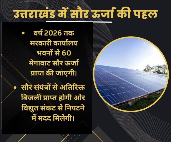 प्रदेश सरकार वर्ष 2026 तक सरकारी कार्यालय भवनों के माध्यम से 60 मेगावाट सौर ऊर्जा संयंत्रों की स्थापना करेगी। इस क्रम में अभी तक 305 सरकारी भवनों में नौ मेगावाट क्षमता के सौर संयंत्र लगाए जा चुके हैं। चालू वित्तीय वर्ष में ही 1695 भवनों में 24.5 मेगावाट क्षमता की स्थापना प्रस्तावित है।