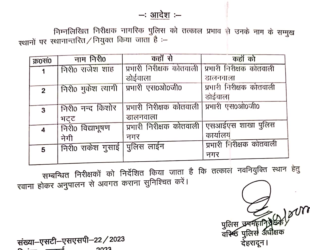 डोईवाला कोतवाली में तैनात राजेश शाह को प्रभारी निरीक्षक डालनवाला जबकि उनकी जगह पर निरीक्षक मुकेश त्यागी को प्रभारी निरीक्षक डोईवाला तैनात किया है। निरीक्षक मुकेश त्यागी एसओजी इंचार्ज थे। निरीक्षक नेहरू कॉलोनी थाना रहते हुए उन्हें निलंबित किया गया था जिसके बाद उन्हें चार्ज नहीं मिल पाया था।