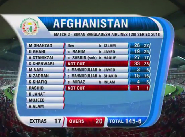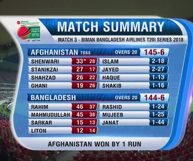 टीम ने 20 ओवर में छह विकेट के नुकसान पर 145 रन बनाए। अफगानिस्तान की ओर से समीउल्लाह शेनवारी ने सर्वाधिक 33 रन (28 गेंद) बनाए और नाबाद रहे। वहीं, बांग्लादेश की टीम ने 20 ओवर में 5 विकेट के नुकसान पर 144 रन ही बना पाया।