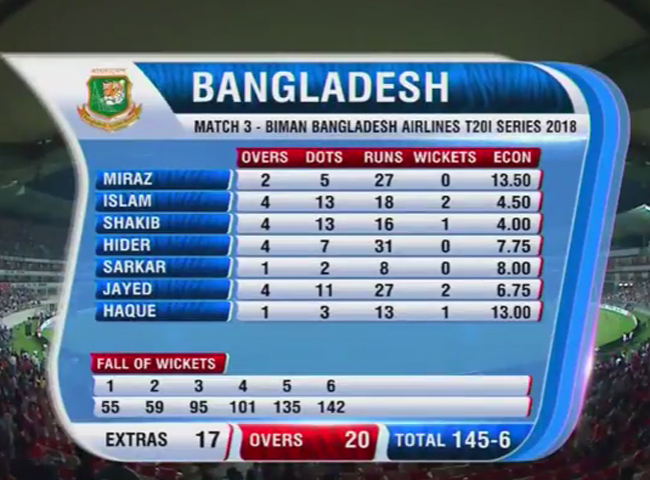 - 20वां ओवर: बांग्लादेश की टीम ने 20 ओवर में 5 विकेट के नुकसान पर 144 रन बनाए।