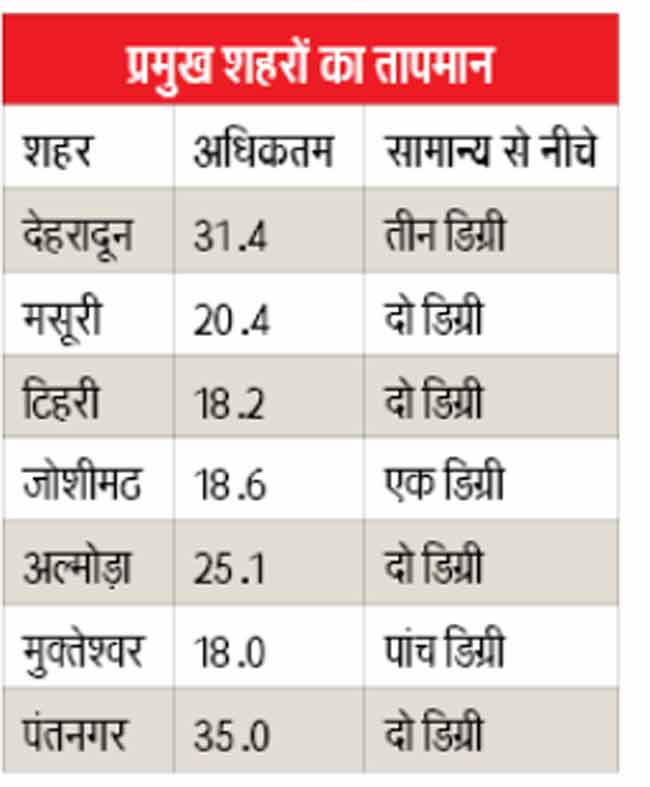 दून समेत प्रदेश के सात प्रमुख शहरों में अधिकतम तापमान में सामान्य से एक से पांच डिग्री सेल्सियस की कमी दर्ज की गई। 2011 के बाद यह पहला मौका है जब मई के दूसरे सप्ताह में देहरादून का अधिकतम तापमान 31.4 डिग्री सेल्सियस रहा। जो सामान्य से तीन डिग्री कम है। हांलाकि न्यूनतम तापमान सामान्य से दो डिग्री अधिक 22.0 डिग्री सेल्सियस रिकॉर्ड किया गया।
