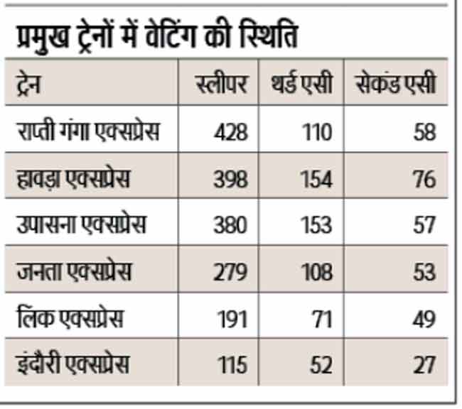 रेलवे के मुख्य आरक्षण पर्यवेक्षक संजय अमन के अनुसार, पूर्वांचल जाने वाली सभी गाडिय़ों में वेटिंग का आंकड़ा 300 के पार है। हालांकि, दिल्ली व दक्षिण जाने वाली ट्रेनों में स्थित सामान्य है। यात्रियों की भीड़ को देखते हुए ट्रेनों में अतिरिक्त कोच बढ़ाने की डिमांड मंडल स्तर पर भेजी गई है।