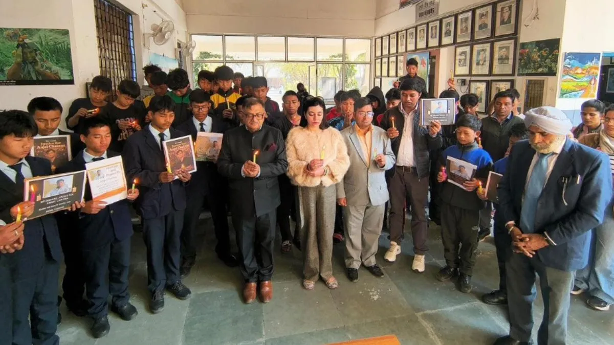 झाझरा में कैंडल जलाकर छात्र इंजेल चकमा को श्रद्धाजंलि अर्पित करते पूर्व राज्य सभा सांसद तरुण विजय व छात्र।