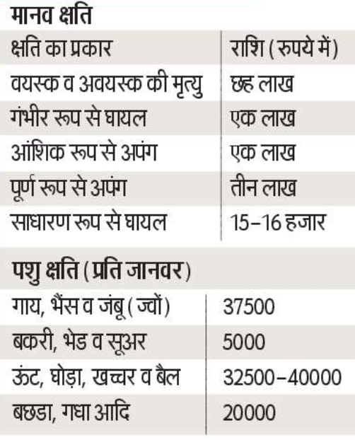 मृत्यु के मामलों में स्वजन को अभी तक आपदा मोचन निधि से चार लाख रुपये की राशि दी जाती थी, जो अब छह लाख की गई है। इसमें दो लाख रुपये मानव वन्यजीव संघर्ष राहत वितरण निधि से उपलब्ध कराए जाएंगे। यह भी कहा गया है कि यदि केंद्र सरकार मुआवजा राशि में वृद्धि करती है तो भी इसमें दो लाख की अतिरिक्त राशि इसी निधि से दी जाएगी। क्षति के अन्य मामलों में भी ऐसा ही किया जाएगा।