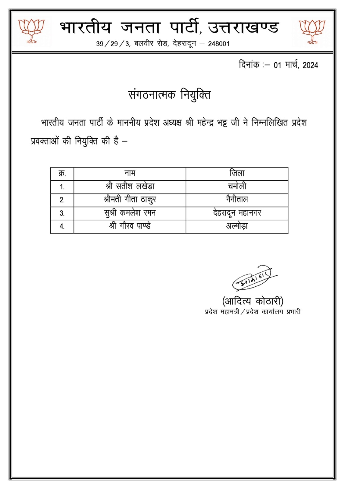 भारतीय जनता पार्टी ने चार प्रवक्ताओं के नामों का एलान किया। इसमें चमोली से सतीश लखेड़ा, नैनीताल से गीता ठाकुर, देहरादून से कमलेश रमन और अल्मोडा से गौरव पाण्डे को प्रवक्ता बनाया गया है।