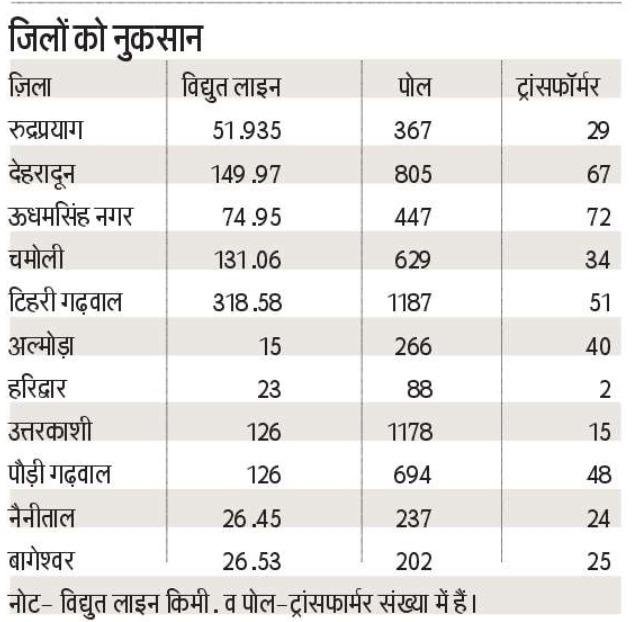 आपदा में विद्युत विभाग को धराली-थराली में जमकर नुकसान हुआ। थराली में कुल 37 किमी. की लंबी लाइन, 228 पोल क्षतिग्रस्त हो गए। वहीं विद्युत वितरण खंड से संबद्ध 318 गांव प्रभावित हुए। उधर धराली में 14 किमी. लंबी लाइन, 84 पोल क्षतिग्रस्त हुए। यहां पर नौ गांवों में विद्युत आपूर्ति प्रभावित हुई।