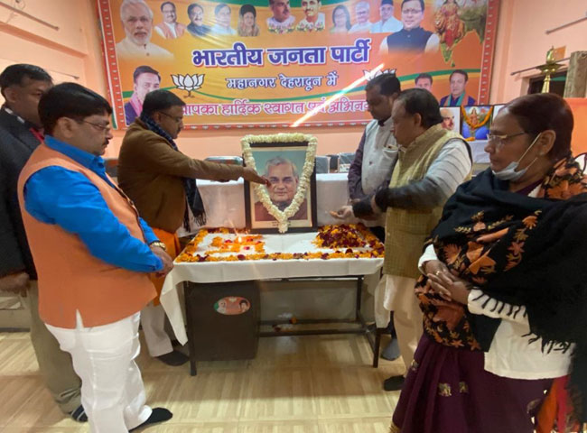 शनिवार को बलबीर रोड स्थित भाजपा के प्रदेश कार्यालय में आयोजित कार्यक्रम में भाजपा के राष्ट्रीय महामंत्री कैलाश विजयवर्गीय ने स्वर्गीय वाजपेयी को याद करते हुए कहा कि उनके जन्मदिवस को संपूर्ण विश्व सुशासन दिवस के रूप में मनाता है। कहा कि उनका सौभाग्य रहा कि उन्होंने अटल के साथ प्रवास भी किया। विद्यार्थी परिषद में उनके सानिध्य में अनेकों बार एक छात्र की तरह उन्हें मार्गदर्शन मिला। कैलाश विजयवर्गीय ने उनकी कविता 'कदम मिलाकर चलना होगा...', को इंगित करते हुए उत्तराखंड के चुनाव के लिए एक रूपरेखा के रूप में प्रस्तुत किया। भाजपा प्रदेश अध्यक्ष मदन कौशिक ने कहा कि आपातकाल के बाद 1977 में हुए लोकसभा चुनाव में जनता पार्टी की जीत हुई थी और वे मोरारजी भाई देसाई के नेतृत्व वाली सरकार में विदेश मामलों के मंत्री बने। उन्होंने संयुक्त राष्ट्र महासभा को हिंदी में संबोधित किया। इस अवसर पर भाजपा नेता शौर्य डोभाल ने कहा जब राजनीतिक व्यक्ति होने के नाते मूल्य आधारित राजनीति का विचार अटल ने ही दिया।
